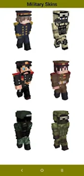 Military Skins for Minecraft, Minecraft Pocket Edition oyuncuları için özel olarak tasarlanmış bir uygulamadır. Bu uygulama, kullanıcıların çeşitli askeri temalı erkek karakter skinlerini kolayca indirmesine olanak tanır. Uygulamanın en dikkat çekici özelliği, sadece bir tıklama ile skinleri indirip, oyun içinde hızlı bir şekilde kullanabilme imkanı sunmasıdır. Kullanıcılar, beğendikleri skinleri seçerek, oyun menüsünde karakterlerini değiştirebilirler.